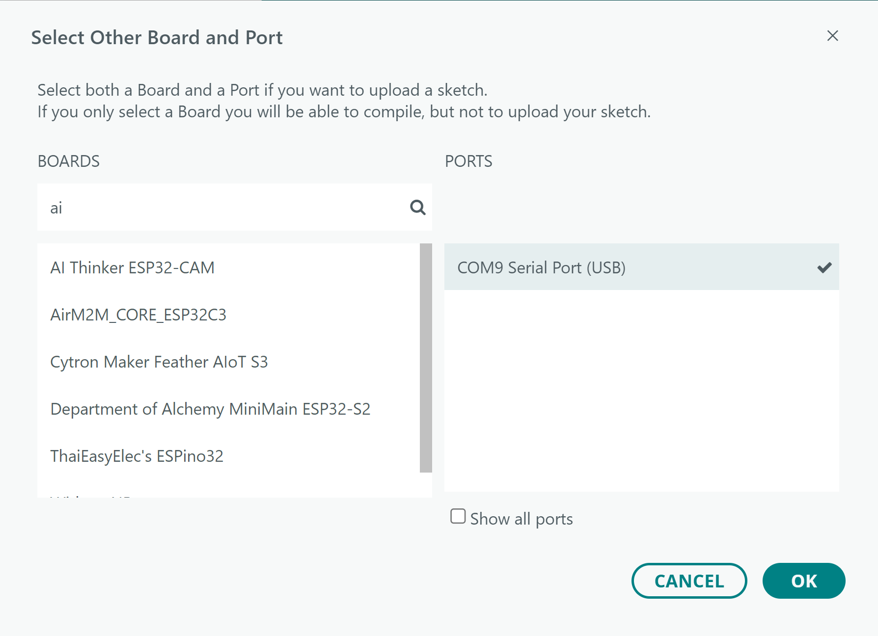 Select COM for the ESP32