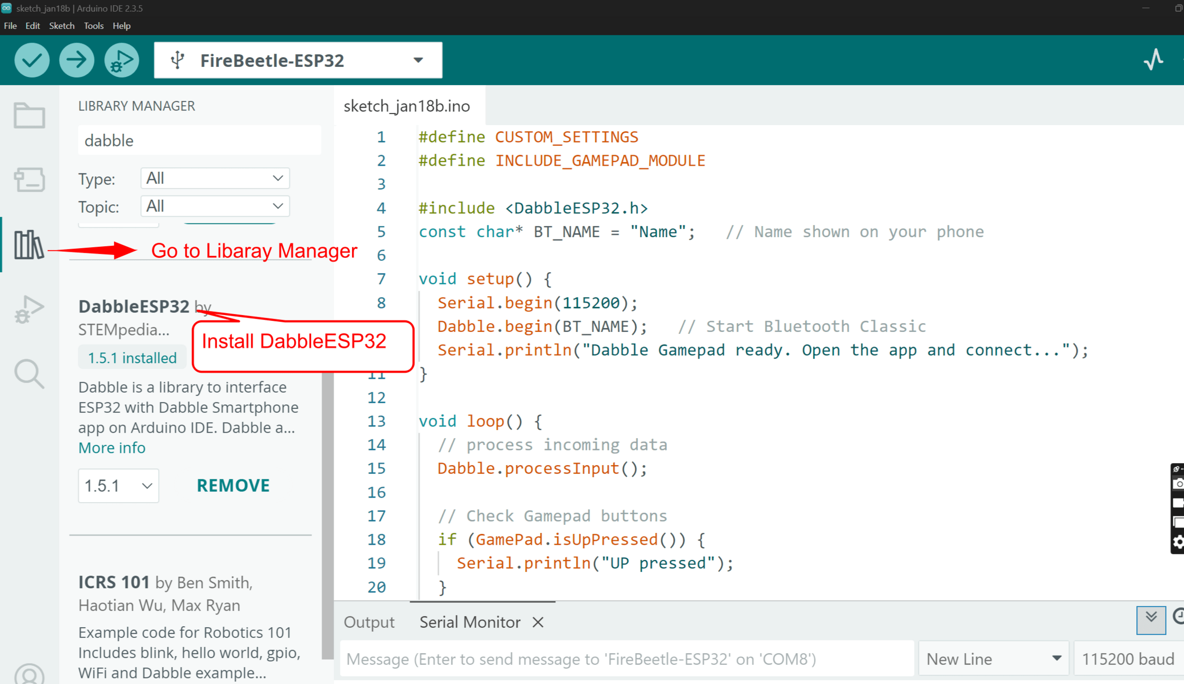 Configure ESP32 to communicate with Dabble